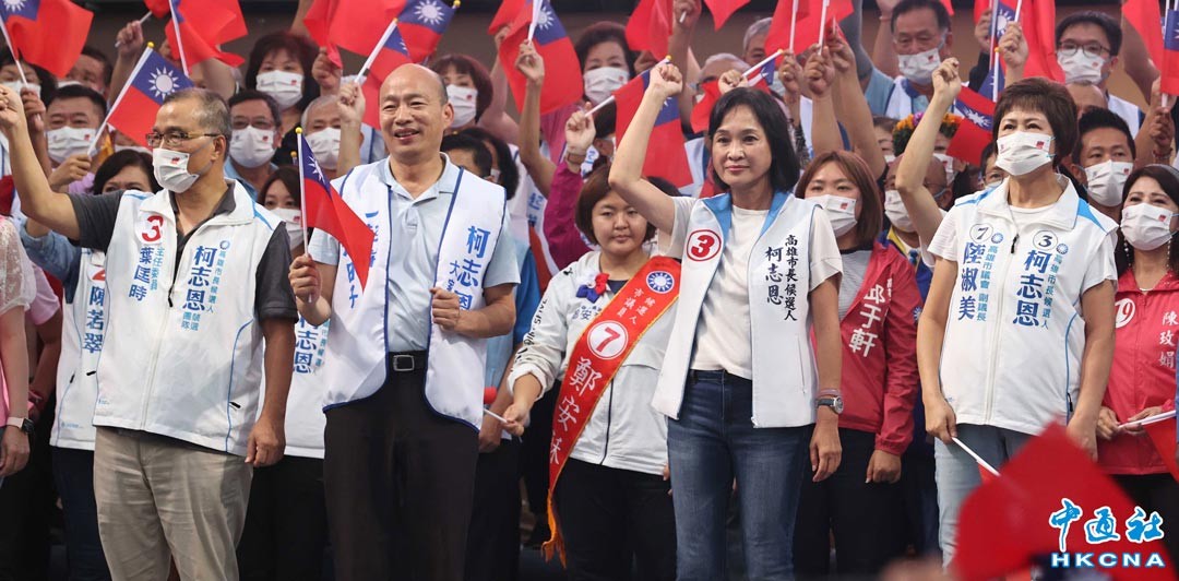 11月20日下午,國民黨台灣高雄市長候選人柯志恩(右二)在高雄市橋頭區台糖花卉中心旁大草皮舉行造勢活動,首度與前高雄市長韓國瑜(左二)合體,韓國瑜拜託大家踴躍投票,改變又老又窮的城市,變成又年輕又有錢。 香港中通社圖片