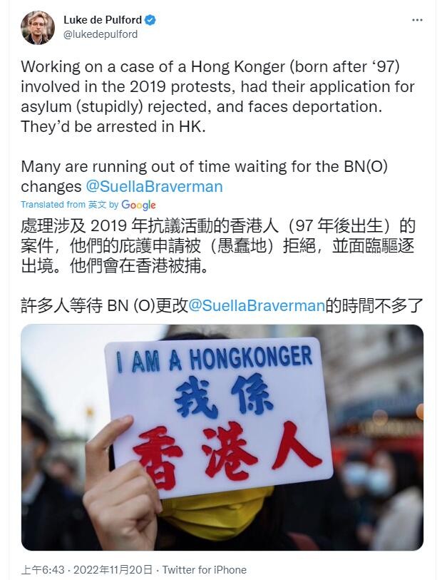 昨日,英國“反華”議員裴倫德率先在推特發文,稱“涉及 2019 年抗議活動的香港人(97年後出生)的案件,他們的庇護申請被拒絕,并面臨驅逐出境。” 裴倫德形容相關決定是“愚蠢的”,這些“港獨廢青”一旦被遣返,“他們會在香港被捕”。他還向英國內政大臣蘇拉·佈雷弗曼發出“呼籲”,“希望能更改BNO的標準”。