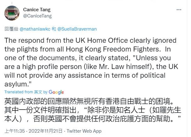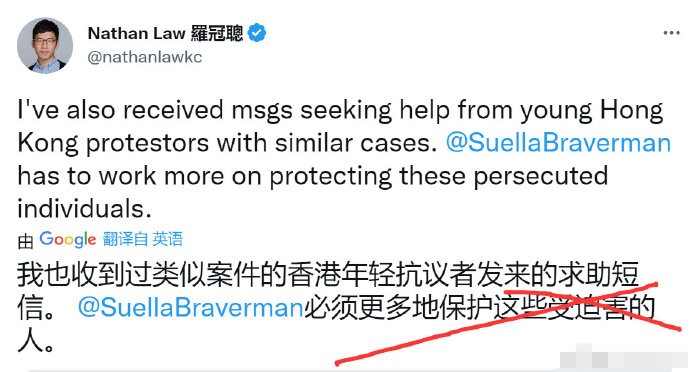 羅冠聰隨後也發帖證實,自己也曾收到過類似案件的“求助短信”。他還同時@英國內政大臣蘇拉·佈雷弗曼,要求他“必須更多地保護”移英的“港獨廢青”。 據介紹,這些移英的“港獨廢青”大多有案底在身,很多仍在香港政府的全球通緝名單之上。修例風波期間,這些人曾在香港街頭大肆破壞,打砸搶燒,犯下種種惡行。後來香港頒佈實施國安法,他們因擔心受到法律的制裁,通過各種非法途徑逃往外地,其中就有部分跑路英國。 與後來通過英國政府給出的所謂BNO留英計劃移英的港人不同,這批“港獨廢青”在英國沒有合法身份,無法透過正規途徑打工、就學,近年來一直游走在灰色地帶,見不得光,受盡歧視,很多人過著朝不保夕的生活。 可能正因如此,據說他們又是現在在英國搞“反華”活動最賣力的人群,比如前段時間在中國領事館門前鬧事的那幾個,聽說就出自這個群體。事後還有英國政客隔空向他們喊話,說“BNO就是英國人”。怎知他們不僅連BNO身份都沒有,還面臨著被遣返的可能。 寂寂無名的他們,與替他們“發聲”的羅冠聰的“光鮮亮麗”,形成了強烈反差。 羅冠聰2020年被香港警方以煽動分裂國家、勾結外國或境外勢力危害國家安全罪通緝,後流亡英國尋求庇護,2021年獲得“難民身份”。這幾年,在境外反華勢力的資助下,羅冠聰到處演講、游學、出書,還有機會參加各種活動,接受國際大牌媒體專訪,可謂“風光無限”。 有網友就透露,英國的一份內部文件明確指出:“除非你是知名人士(如羅先生本人),否則英國不會提供任何政治庇護方面的幫助。”