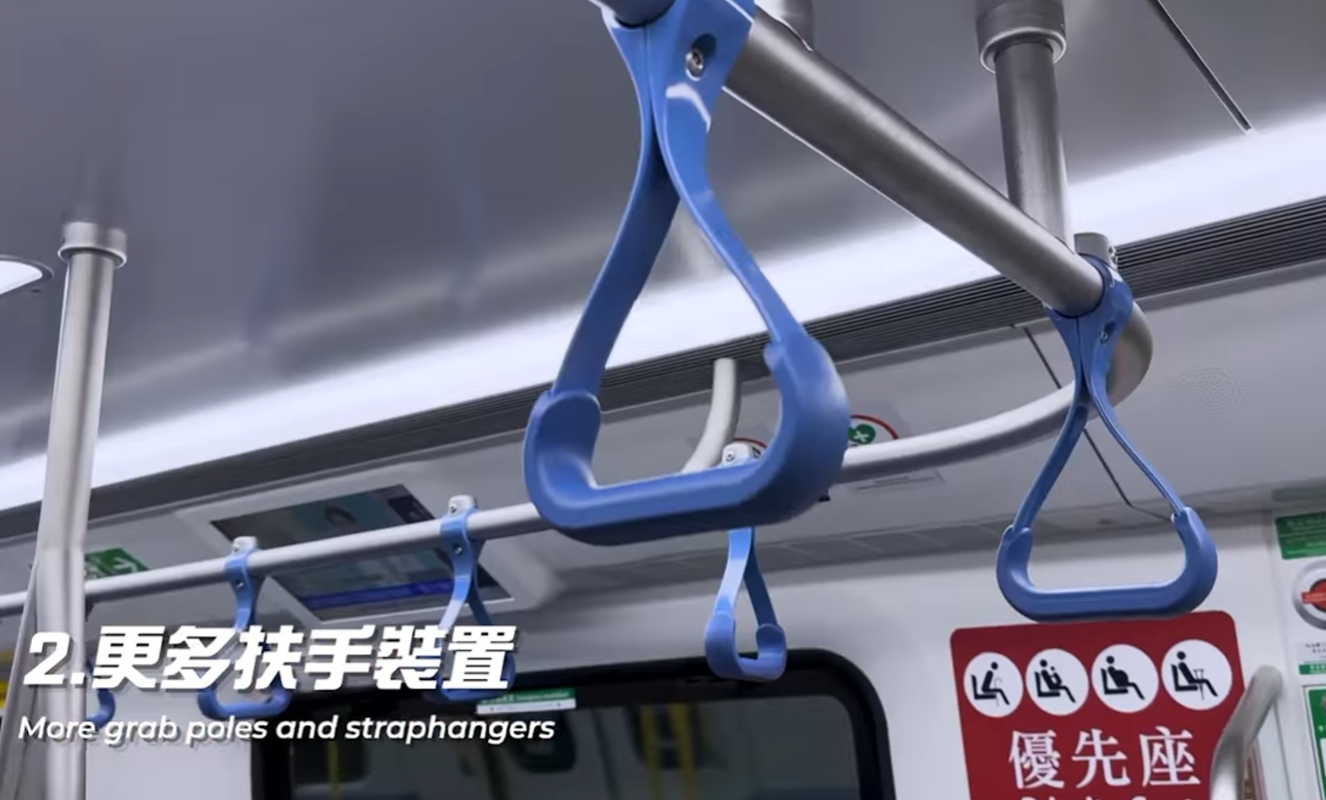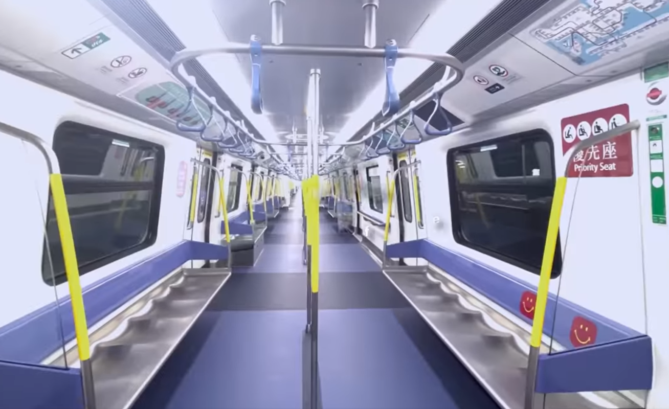 全新的市區綫八卡列車。港鐵FB影片截圖 至於車廂方面,楊美珍介紹指,全新的市區綫八卡列車設有更多扶手裝置,包括環型扶手桿及吊環扶手;部分車門旁的玻璃屏風亦會稍微移入車廂,使上落車位置更為寬敞;座位由人體工學設計;全面採用LED照明;列車上亦會配備智能伺服器,以便工程人員可以實時遙距監察列車運作。