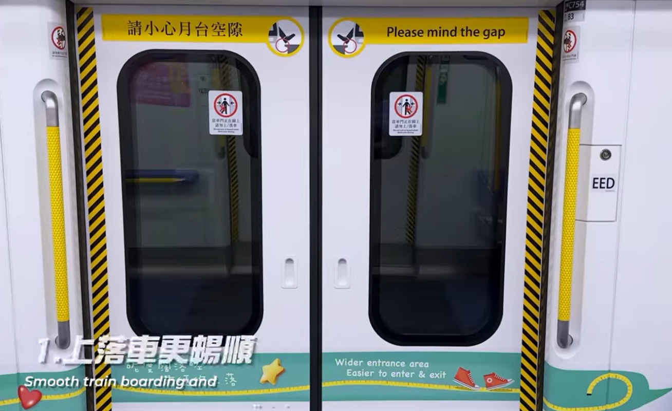 上落車位置更為寬敞。港鐵FB影片截圖 車務總監李家潤表示,新車座位數目不變,惟佈置上有所調整。最後一批新車將於2027年抵港,預料整個更換計劃要在2028/29年度完成。他又說,新車的緊急出口斜道設有獨立傳感器,當乘客有需要推門離開時,會發送訊號至控制中心,較原有做法更快做好保護工作。
