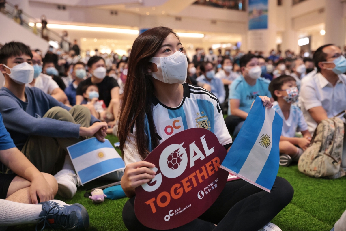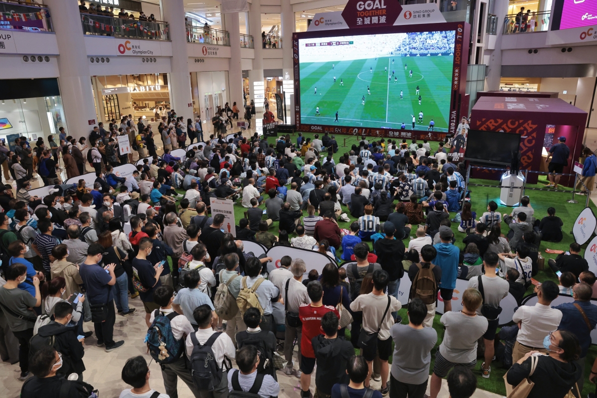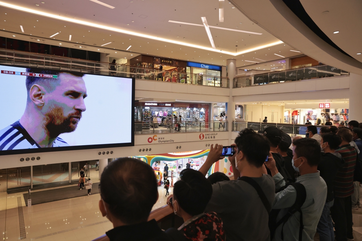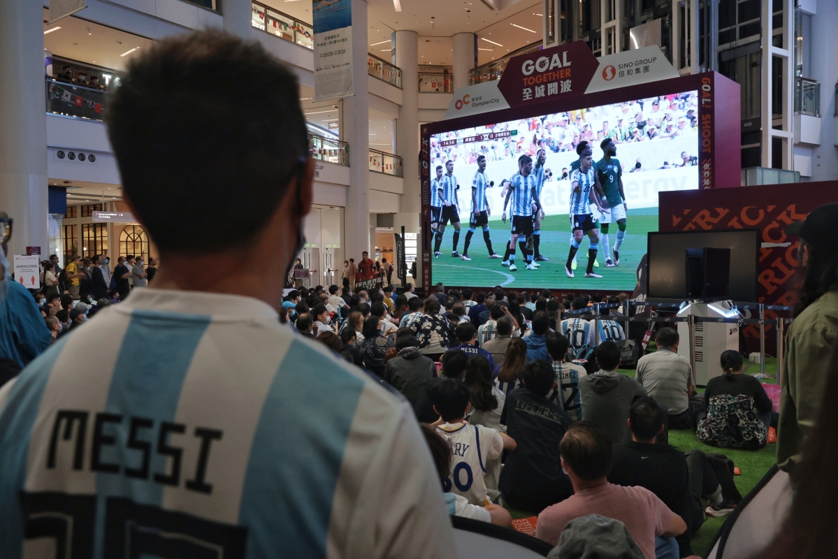 香港新聞網11月22日電(記者謝光磊)22日,2022世界杯C組首輪展開爭奪,阿根廷對陣沙特。 球王梅西本屆世界杯首度登場,吸引大批香港球迷在一商場觀戰,呐喊加油。結果,世界盃C組賽事爆出大冷門,沙特阿拉伯以2:1反勝阿根廷,全取三分。