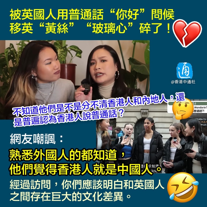 “在外國人眼裡,只分白人、亞裔、黑人、中東人。”有網友提醒兩位移英“黃絲”“不要抬高自己,英國人根本不在乎HKer和中國人有何不同。” “不如下次問問外國友人懂不懂分辨上海人、北京人、四川人、湖南人、福建人等等。”還有網友忍不住揶揄稱,“對了,還有懂不懂分辨廣東人和香港人。” “熟悉外國人的都知道,他們覺得香港人就是中國人。”有網友喊話移英“黃絲”,“經過訪問,你們應該明白,(你們所謂的)香港人和英國人之間存在巨大的文化差異。” 【編輯:張琦】