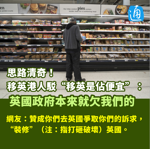 香港新聞網12月2日電 移英港人又開始在其社交媒體上發帖抱怨了,這次抱怨的是英國政府。 近日,一名移英港人在其海外社交媒體上發帖,為1997年前出生的香港人“打抱不平”。她寫道,她和英國同事聊天,同事覺得英國政府欠了1997年前出生的香港人,因為如果英國政府不是在1984年被人(注:指中方)“騙”了,簽了份申明,香港人就不用通過移民來到英國。 她認同同事的說法,不能說香港人移民到英國就是在佔便宜,英國人的福利是移英港人應得的,因為“他們本來就是英國人”。 這“思路清奇”的言論引來一片嘲諷。大批網友給發帖人“出謀劃策”:“贊成你們去英國爭取你們的訴求,‘裝修’(注:指打砸破壞)英國。”“那趕緊上街去爭取啊。”“為何不抗爭呢,當英國順民,我瞧不起你。”“努力吧!說不定能當英國首相!”