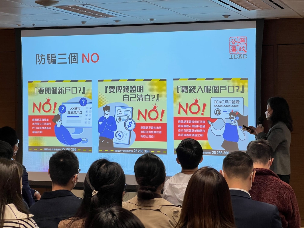 主辦方提供 廉政公署人員在講座中向青年介紹廉署日常工作、專業誠信的重要性,並以電影片段、生活實例等方式生動地講解何謂貪污、利益衝突、以及道德抉擇原則等。最後的有獎問答環節、提防騙徒冒充廉署人員及“舉報貪污口號由你競選”投票活動,青年們亦踴躍參與,積極互動,並將本次活動推向高潮。