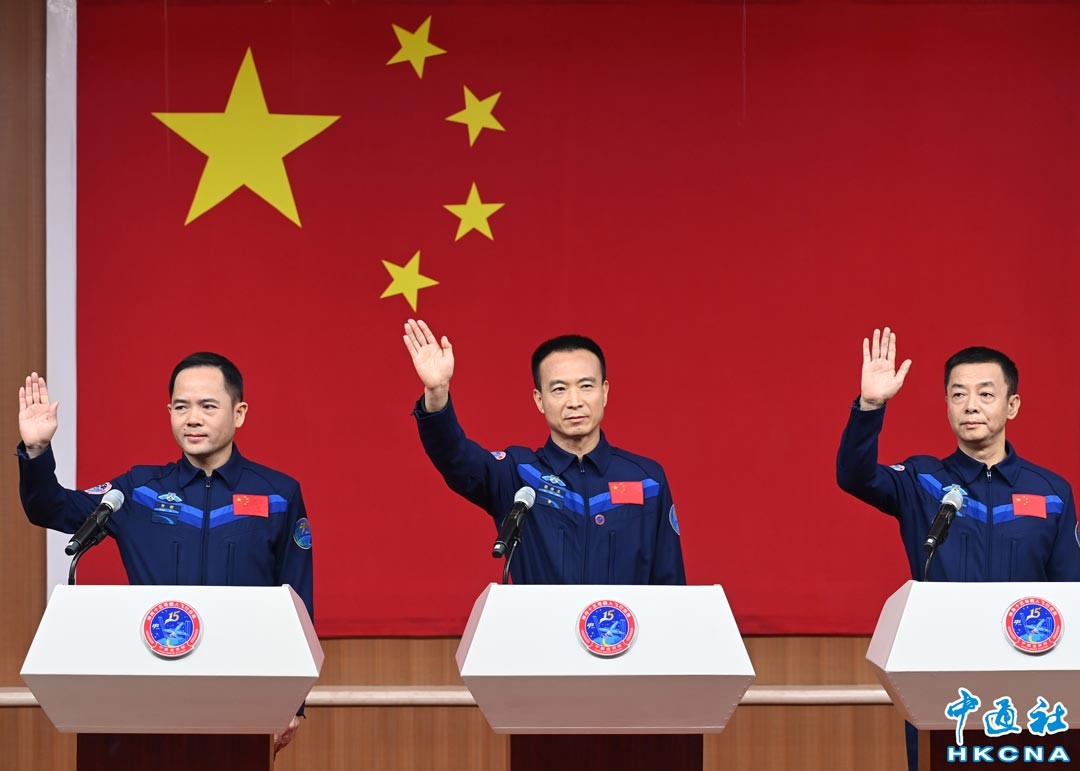 11月28日,執行神舟十五號載人飛行任務的航天員乘組費俊龍(中)、鄧清明(右)、張陸在酒泉衛星發射中心問天閣與中外媒體記者集體見面,并回答記者提問。 香港中通社圖片