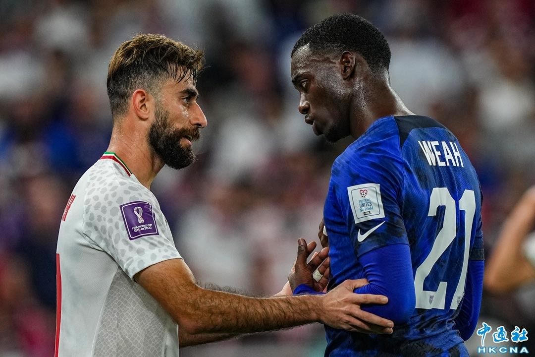 當地時間11月29日,卡塔爾世界盃B組美國隊對伊朗隊的小組賽在阿圖瑪瑪球場進行,這場比賽被譽為美伊世紀之戰,結果美國隊1-0小勝伊朗隊。圖為雙方球員在比賽中交流。香港中通社圖片