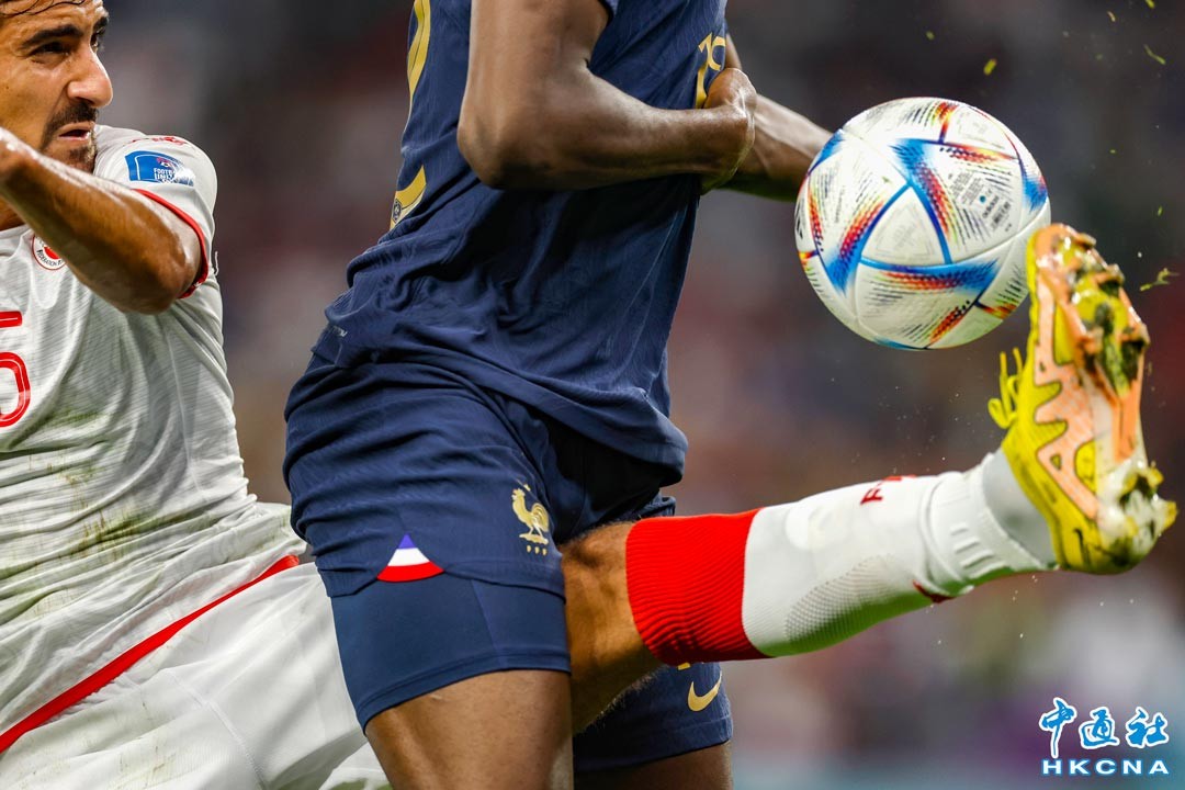 當地時間11月30日,2022卡塔爾世界盃小組賽D組第三輪突尼斯(白)與法國的比賽在教育城體育場舉行。最終突尼斯隊1:0戰勝法國隊。圖為突尼斯球員本·拉馬丹(白衣)進攻。 香港中通社圖片