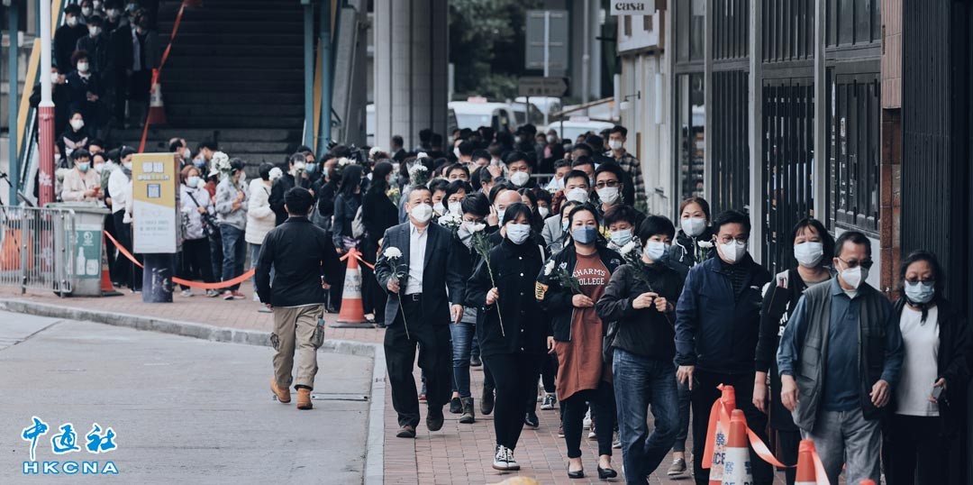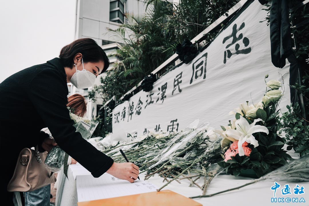 前國家主席江澤民患白血病合併多臟器功能衰竭,搶救無效,於2022年11月30日12時13分在上海逝世,享年96歲。中央人民政府駐香港特別行政區聯絡辦公室1日發出公告,公佈弔唁安排。前來弔唁的人士可以提前預約,進入中聯辦大樓現場弔唁。圖為不少香港市民有序前往中聯辦大樓外獻花弔唁。(香港中通社記者 許其皓攝)