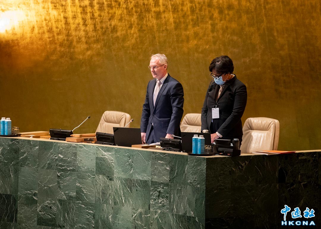 當地時間12月1日,第77屆聯合國大會在紐約聯合國總部舉行體育促進發展與和平一般性辯論,會前聯大主席克勒希主持默哀儀式,哀悼中國前國家主席江澤民逝世,各國代表起立默哀一分鐘。圖為聯大主席克勒希(左)主持默哀儀式。 香港中通社圖片