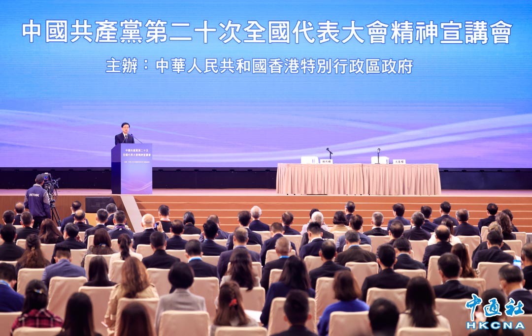 中國共產黨第二十次全國代表大會精神宣講會3日下午於香港會議展覽中心舉行。特區行政長官李家超致辭時指出,二十大精神關係到國家與香港的未來發展,關係到“一國兩制”的行穩致遠和香港的長期繁榮穩定。(香港中通社記者 曹文毓攝)