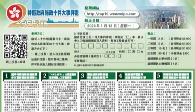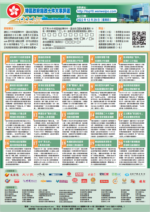 香港新聞網12月8日電 由香港文匯報發起,大公報、大學生報、中國日報、有線新聞台、明報月刊、香港中國通訊社、香港電台等23家媒體聯合主辦的“特區政府施政十件大事評選”即將接受投票,投票截止日期2022年12月29日。香港市民可透過網站(http://top10.wenweipo.com)、郵寄、傳真等方式參加評選,選出他們認為最具影響力和最關心的“特區政府施政十件大事”,參與評議政府施政。 本屆“2022年特區政府施政十件大事評選”由香港大公文匯傳媒集團和各界社會團體鼎力贊助,獎品豐厚,共設一等獎(兩名)、二等獎(五名)、三等獎(十五名)、紀念獎(三十名)、“最踴躍參加學校獎”(三間),“最踴躍參加機構獎”(一間)。