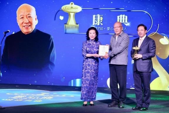 北師大中國公益研究院院長王振耀(右)、北京海鷹脊柱健康公益基金會理事長劉海鷹(左)為周秉德頒獎 香港金融界老將康典,2001年香港慈善機構桂馨基金會創辦人、2008年北京桂馨慈善基金會發起人,自上世紀90年代起,借公益慈善的力量改善鄉村兒童教育環境,實現教育公平和可持續發展。康典發表獲獎感言時,特別提到曾親身去到地震後的北川中學廢墟,看見高山上滾下來的石頭比房子都大,農村老師為保護學生犧牲自己的舉動令人震動,說到此處,康典情緒激動,現場觀眾也深受感染,無不動容。