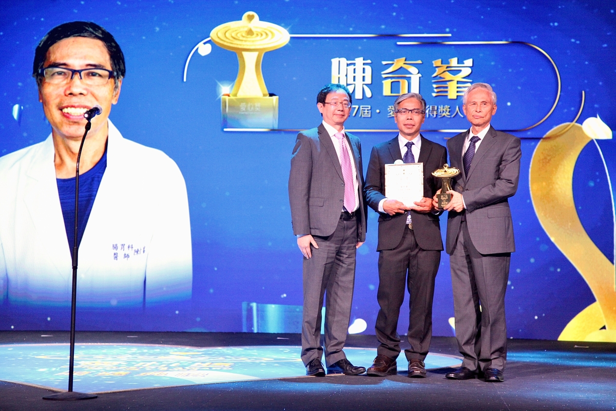 前臺灣政治大學國際關系教授甘逸驊(左)、港澳臺灣慈善基金會副主席林俊傑(右)為陳奇峯頒獎 本屆愛心獎頒獎典禮邀請到愛心獎終選委員會主席、香港特區律政司前司長梁愛詩,香港特區民政及青年事務局局長麥美娟,全國人大常委會香港基本法委員會副主任譚惠珠,北京師範大學中國公益研究院院長王振耀,鳳凰衛視董事局主席兼行政總裁徐威,港澳台灣慈善基金會主席王茂林,陳守仁基金會創辦人陳守仁等嘉賓出席,攜手傳揚愛心。