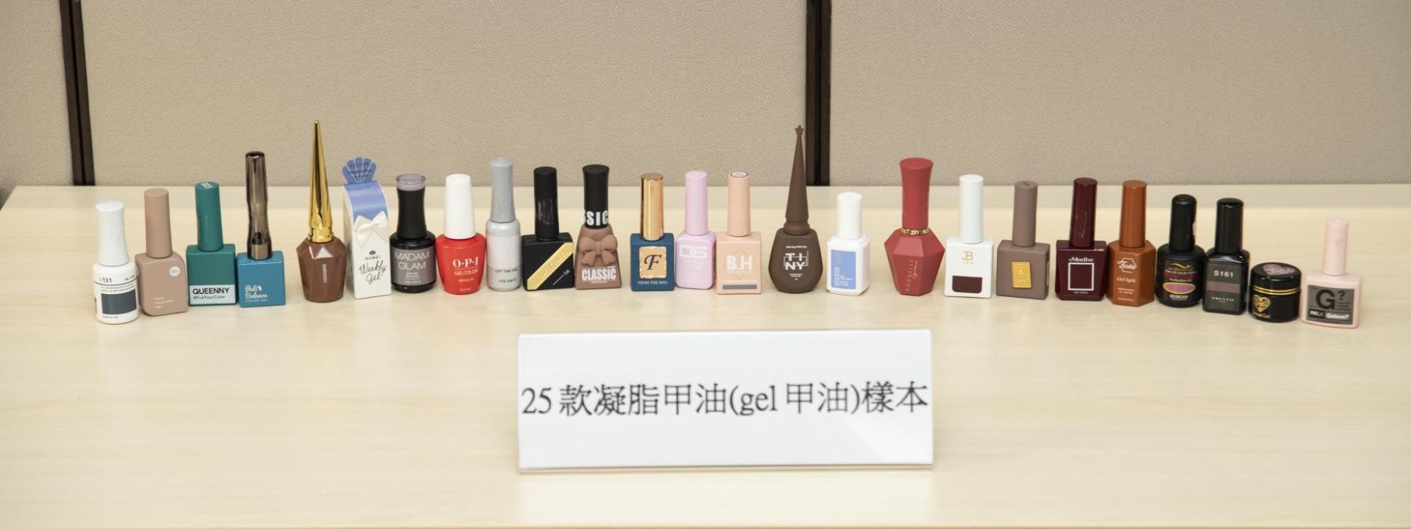 消委會圖片。 1款檢出禁用物質“苯” 12款樣本檢出“二甲苯” 是次測試中,一款指甲油樣本“Madam Glam”的Soak-off Gel Polish被檢出每公斤0.26毫克苯。根據歐盟法規,苯屬於第一A級致癌物和第一B級可導致基因發生永久性突變的物質,屬歐盟《化妝品法規》及內地《化妝品安全技術規範》中的禁用物質,不能刻意添加在化妝品之中。短期健康風險包括頭痛、暈眩及心跳加速,長期接觸更可能構成致癌風險及損害神經和免疫系統。雖然檢出量屬於微量,但由於苯屬已知人類致癌物,消委會建議消費者避免選用含這類物質的產品。 有12款樣本檢出二甲苯,分別是“BEHOLD”Professional Gel Polish、“essie”essie.gel-gel nail color、“TINY”Professional Color Gel、“estemio”estemio、“ADORELLE”Color Gel Signature、“Pedi Balance”Color Gel、JIN.BJIN.B IVY Color Gel (UV/ LED)、“FIOTE”Gel light Professional UV-LED Gel、“QUEENNY”#Pick Your Color Gel Polish、“GENTLE PINK”Gentle Pink Color Gel、“OPI”OPI GEL Color-Soluble/Soak off、“HI GEL”Color Gel,檢出量由每公斤0.99毫克至120毫克。根據歐盟法規,二甲苯屬於第四級急性毒性,但未有為其訂下濃度上限。 另外,全部樣本均檢出甲苯,檢出量由每公斤1.6毫克至47毫克,低於歐盟《化妝品法規》的上限(甲苯只限使用於指甲油,而濃度上限為25%,即每公斤250,000毫克)。短暫暴露於甲苯之中,可能會刺激眼睛、呼吸道和皮膚,引致頭痛及肌肉疲勞,長期接觸或會對肝臟、神經系統,和發育中的胎兒的健康等造成影響。由於甲苯對發育的胎兒和兒童健康的影響較大,因此孕婦和哺乳中的婦女應盡量避免使用含甲苯的產品。