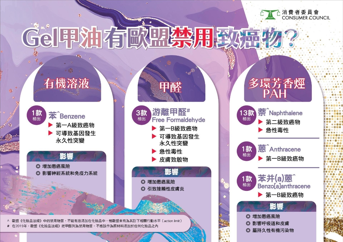 消委會圖片。 3款樣本檢出致敏物甲醛 測試又發現,3款樣本檢出游離甲醛,分別是“QUEENNY”#Pick Your Color Gel Polish、“GENTLE PINK”Gentle Pink Color Gel、“HI GEL”Color Gel。甲醛是常見於化妝品中的防腐劑,用作防止細菌生長。根據歐盟《化妝品法規》,甲醛屬於第一B級致癌物、第二級可導致基因發生永久性突變的物質、第三級急性毒性及第一級的皮膚致敏物。3款樣本檢出量由0.006%至0.010%,但符合內地2015年《化妝品安全技術規範》對甲醛的要求(游離甲醛的總量不能超過0.2%,並且禁用於噴霧產品)。 是次測試於樣本中檢出6種多環芳香烴,當中3種被歐盟列為禁用物質,包括屬第一B級致癌物的蒽和苯并(a)蒽,以及屬第二級致癌物和第四級急性毒性的萘。在25款樣本中,有14款(56%)檢出1至2種歐盟禁用的多環芳香烴﹕以每公斤計,13款樣本檢出萘,檢出量由0.01毫克至0.20毫克;1款樣本FROM THE NAIL“Color Gel”檢出0.01毫克蒽;另1款樣本“First Street”Color Gel Polish同時檢出0.01毫克苯并(a)蒽及0.04毫克萘。 16樣本檢出損呼吸道和皮膚的多環芳香烴 測試結果發現有16款樣本分別檢出1至3種多環芳香烴(簡稱PAHs),“FROM THE NAIL”Color Gel檢出3種PAHs,而6款樣本,包括“DGEL”Mini Bold Color Gel、“ADORELLE”Color Gel Signature、“First Street”Color Gel Polish、“NCLA Gelous”天然無毒Gel甲油、“Pedi Balance”Color Gel 和 “I'ZEMI”Color Gel則檢出2種PAHs。測試結果顯示,13款樣本檢出萘(Naphthalene),包括“DGEL”、“ADORELLE”、“FIOTE”等,檢出量由每公斤0.01毫克至0.20毫克,當中以“HOMEI”和“OPI”的檢出量最高,均檢出每公斤0.20毫克萘。另外,“First Street”和“FROM THE NAIL”分別檢出每公斤0.01毫克苯并(a)蒽和每公斤0.01毫克蒽。此外,3款樣本檢出菲,包括“Grace Gel ”、“FROM THE NAIL ”和“NCLA Gelous”,檢出量均為每公斤0.01毫克。2款樣本檢出苊,包括“ADORELLE”(#11)和“I’ZEMI”(#22),檢出量分別為每公斤0.05毫克及0.20毫克。4款樣本檢出茀,包括“DGEL”、“FROM THE NAIL”、“Pedi Ba l a n ce”和“QU EEN N Y”,檢出量由每公斤0.01毫克至0.03毫克。