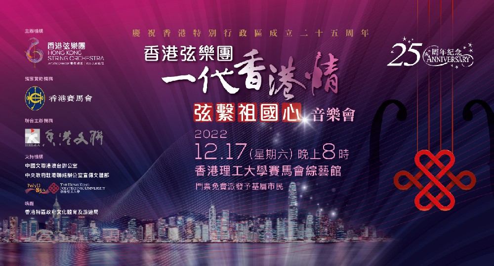 香港弦樂團、香港文聯聯合主辦《一代香港情‧弦繫祖國心》音樂會香港新聞網12月18日電 為慶祝香港回歸祖國 25 周年及中華人民共和國成立 73 周年,香港弦樂團於創辦人及藝術總監姚珏帶領下,繼月前舉辦《弦音傳承》國慶音樂會及《管頌情‧弦續愛》國慶 73 周年音樂會後,17日晚間壓軸舉辦《一代香港情‧弦繫祖國心》音樂會。 《一代香港情‧弦繫祖國心》音樂會榮獲香港賽馬會獨家贊助,由姚珏率領全港頂尖弦樂青年精英,演奏一套匯萃中西文化作品的節目,展現香港青年音樂家的蓬勃朝氣與風采,頌揚全港迎接新征程、新飛躍的信心。本次音樂會更特別安排基層家庭及社會有需要人士免費欣賞,以悠揚弦樂與眾同樂,與社會大眾同慶香港特別行政區回歸祖國25周年的喜悅時刻。