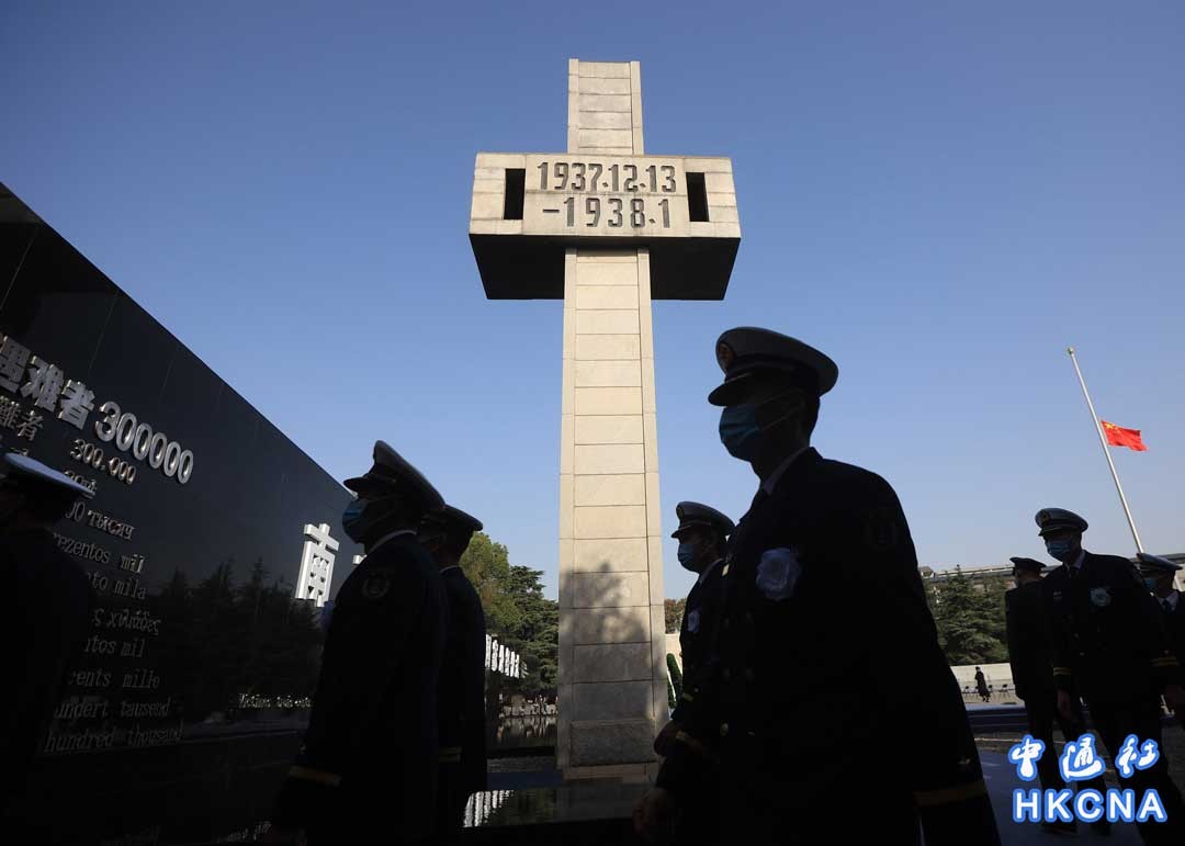 12月13日是南京大屠殺死難者國家公祭日。當天上午,南京大屠殺死難者國家公祭儀式在侵華日軍南京大屠殺遇難同胞紀念館舉行。圖為參加國家公祭儀式的人員從侵華日軍南京大屠殺遇難同胞紀念碑前走過。 香港中通社圖片