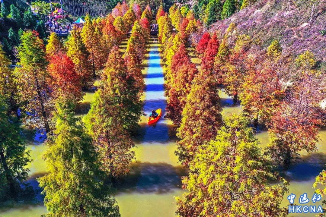 台灣苗栗縣三灣落羽松秘境﹐300多棵落羽松漸轉成橘紅色,進入最美時刻,搭配山景、水中倒影,優雅景緻,吸引大批遊客前往拍照打卡。 香港中通社圖片
