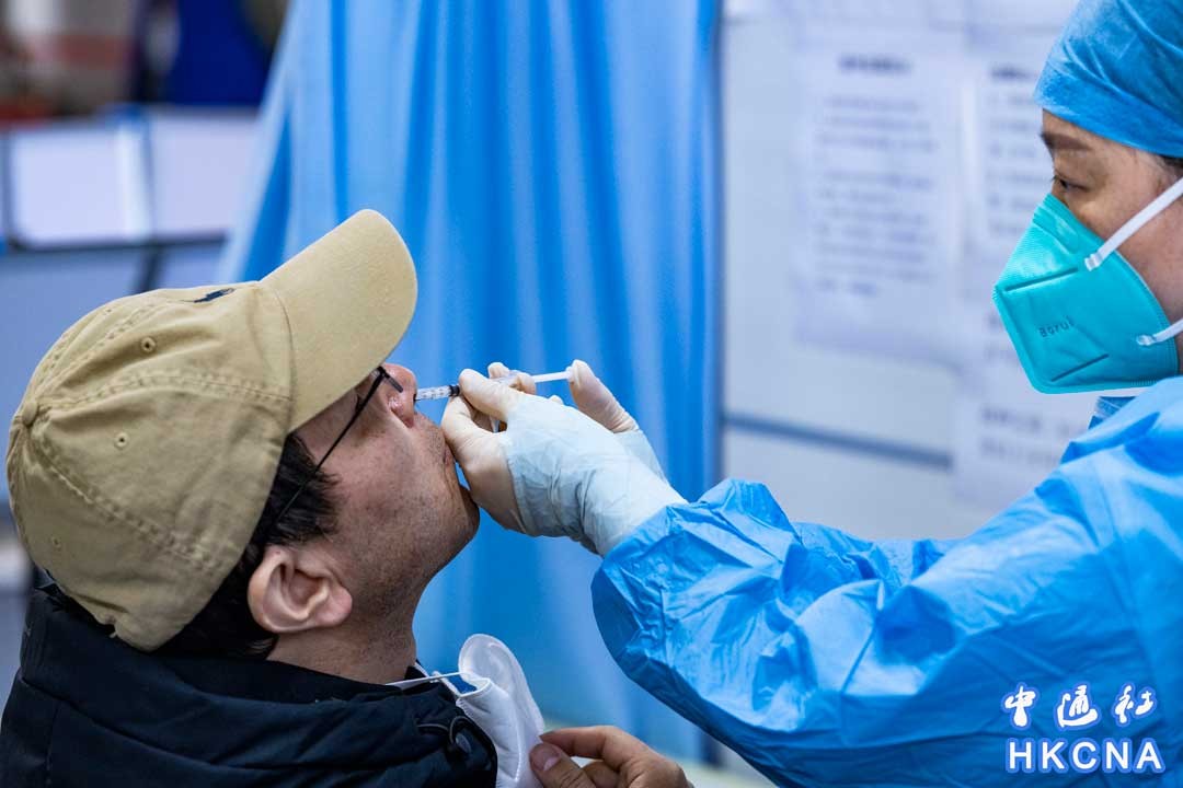 12月16日,北京市朝陽區東風鄉疫苗接種點內,一位市民通過鼻噴方式進行新冠病毒疫苗第二劑次加強免疫接種。該款鼻噴流感病毒載體新冠肺炎疫苗已由中國國家衛健委提出建議,國家藥監局組織論證同意後於12月初批准緊急使用。 香港中通社圖片