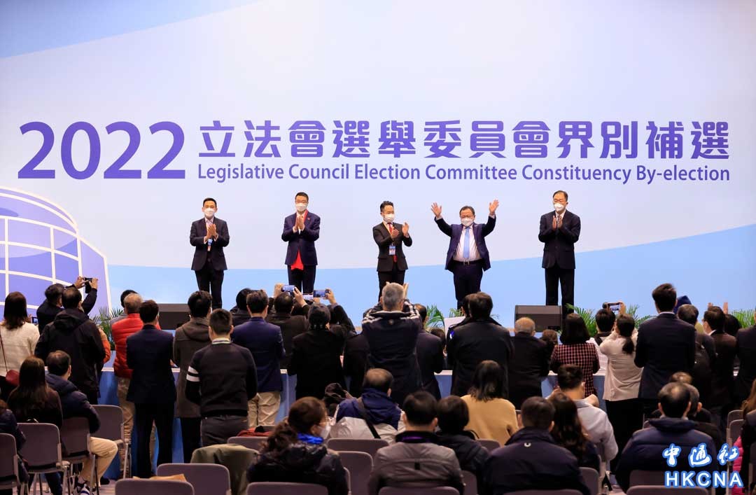 香港立法會選舉委員會(選委會)界別補選18日舉行,六名候選人角逐四個議席。 最終,黃錦輝(右一)、陳永光(右二)、何敬康(中)和尚海龍(左二)在當日的補選中當選。(香港中通社記者 曹文毓攝)