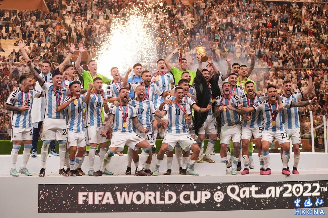 當地時間12月18日,阿根廷隊球員慶祝奪冠。當日,在卡塔爾盧賽爾球場進行的2022卡塔爾世界盃足球賽決賽中,阿根廷隊與法國隊在常規時間和加時賽戰成3比3平,通過點球大戰阿根廷隊以總比分7比5獲勝,奪得冠軍。 香港中通社圖片