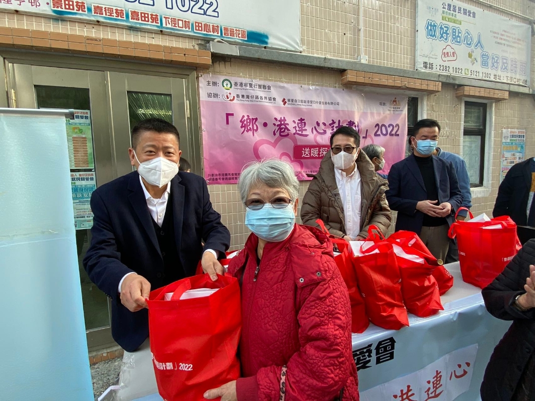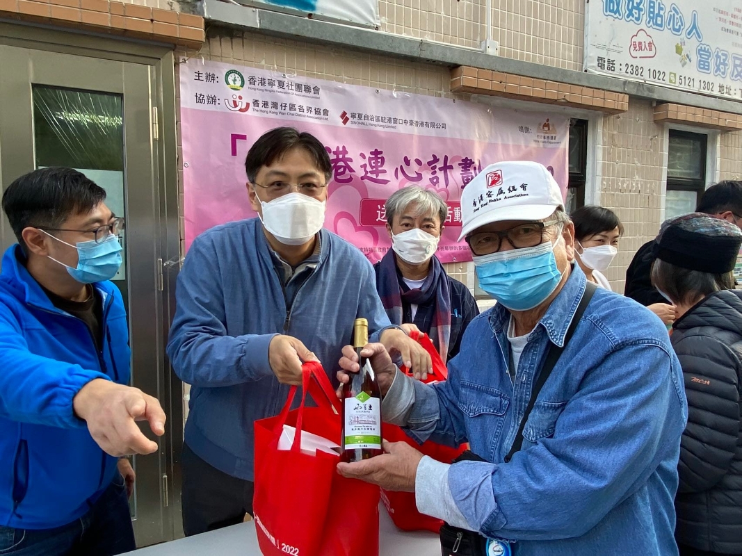 情系香港同胞:寧夏社團冬至基層送暖香港新聞網12月20日電 12月20日,由香港寧夏社團聯會主辦,民政事務總署贊助,香港灣仔區各界協會、寧夏自治區駐港窗口中豪香港有限公司協辦的“鄉•港連心計劃”2022送暖探訪活動之香港公屋居民關愛會基層關愛大行動在沙田舉行。香港寧夏社團聯會會長閻偉寧、執行會長陸紀仁、常務副會長兼秘書長郭康平、常務副會長何志堅、副秘書長蔡偌妃、寧夏港區政協委員何耀康以及香港公屋居民關愛會副總幹事李林昌、顯徑辦事處主任陳德立等有關領導來到現場為基層市民派發裝滿寧夏灘羊、寧夏枸杞、寧夏葡萄酒、紅棗雞湯、粉絲、豆豉鯪魚以及防疫口罩等產品的福袋,在冬至來臨之際,讓基層市民在香港品嘗到寧夏味道,進而瞭解寧夏,感受香港寧夏社團聯會、香港灣仔區各界協會、香港公屋居民關愛會、寧夏自治區駐港窗口中豪香港有限公司、民政事務總署等社會各界的慰問與關懷,溫暖同行,共建香港和諧社會,共享祖國發展榮光。