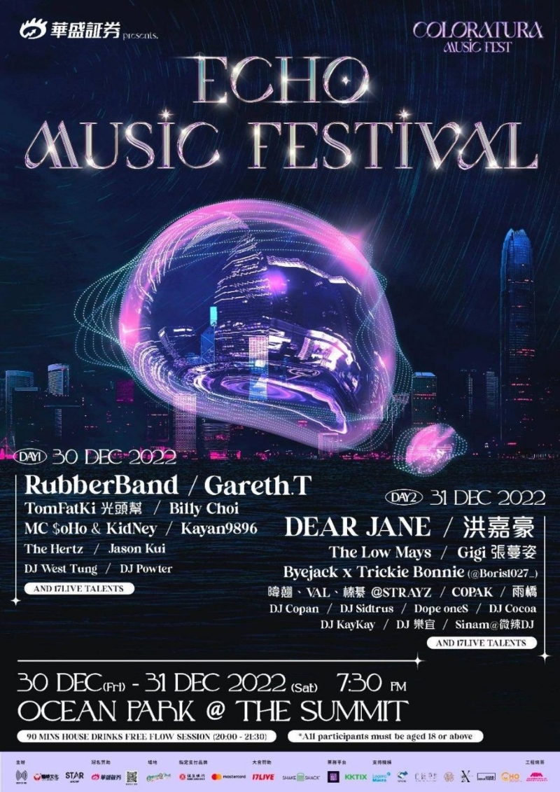 海洋公園高峰樂園舉行《Coloratura Countdown Music Festival 2022》戶外音樂節,表演嘉賓陣容鼎盛,有RubberBand、Dear Jane、洪家豪和雨橋,音樂狂迷不要錯過,想必氣氛一定沸騰! 日期:2022年12月30-31日;2023年1月1日 時間:19:30 - 21:30 地址:香港島黃竹坑黃竹坑道180號 海洋公園高峰樂園 價錢:HK$780 (單日門票) 3.D2 Place集市《年末隧道 2023 Market & Countdown Live 》