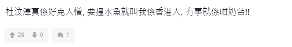 有“手足”嘲諷杜汶澤現在就是“精神台灣人”,揶揄他喊港人去台消費是在“賺港養台”。 “杜汶澤真是好惹人憎,要找水魚(指冤大頭)就叫我是香港人,沒事就‘奶台’!”還有“手足”忍不住吐槽。