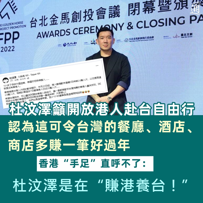 香港新聞網12月30日電 香港“黃絲”藝人杜汶澤離港赴台後,小動作多多,又是搞網台,又是造女團,還進軍食品界撈盡“手足”油水。怎知,花樣搞多了,一向甘願為“情懷”付費的“自己人”也不買杜汶澤的賬了! 近日,杜汶澤在社交媒體發文,聲稱台北101多了很多遊客,有泰國、印尼及菲律賓人,就是沒有香港人。 他指近期港人離境人數攀升,香港機場出境人次統計數字顯示,12月20日起,港人離境數字連續3日突破2.6萬人次,22日更高達2.8萬人次,粗略計算過去7日離境港人已近20萬人次…… 就此,他呼籲台當局盡早開放香港人自由行,讓一直都喜歡來台消費的香港人盡快來玩,認為這可令台灣的餐廳、酒店、商店多賺一筆好過年。杜汶澤還說,自己問過很多台灣人,這也是他們的希望…… 在台當局的“政治操作”下,現時,港人只可以旅行團方式赴台觀光,每團人數限5至40人,最長停留15天。