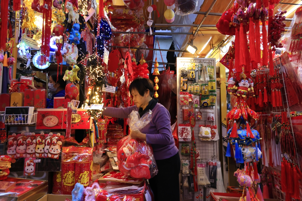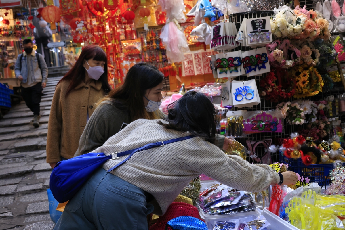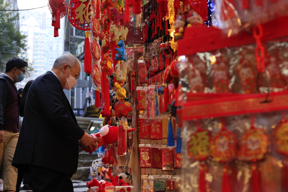 香港新聞網1月1日電(記者 曹文毓)邁入2023年,香港中環石板街搖身一變,裝點新年氣息,整條街道呈現紅火色彩,充滿年味,街道兩旁鋪位也開始售賣新年裝飾品,不少市民前來挑選和拍照。