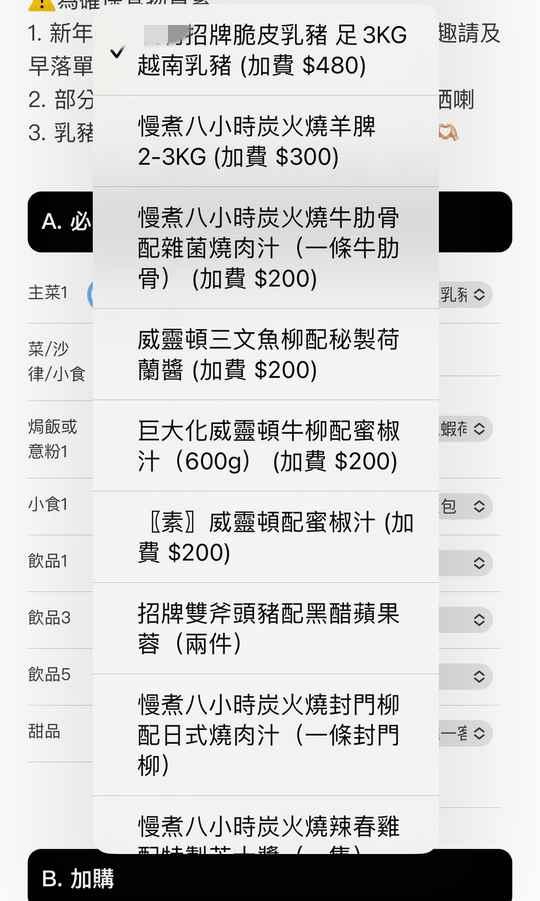 日前,有香港網友在“黃絲”聚集地——“連登討論區”發帖稱,有“黃店”餐廳推出一款“6-8人乳豬到會套餐”,但1200港幣的價錢卻不包括主角“乳豬”,實際上要多給480港幣才會有。 根據這間“黃店”貼出的廣告,這款套餐包含主菜2份、菜或沙律1份、飯或意粉2份、小食2份、飲品6份、甜品日本泡芙1份。 不過,該網友卻發現,在選擇主菜時,如果選擇乳豬,竟然要加錢購買,另外5款主菜也要多付200-480港幣;而其他6款主菜則不用加錢。