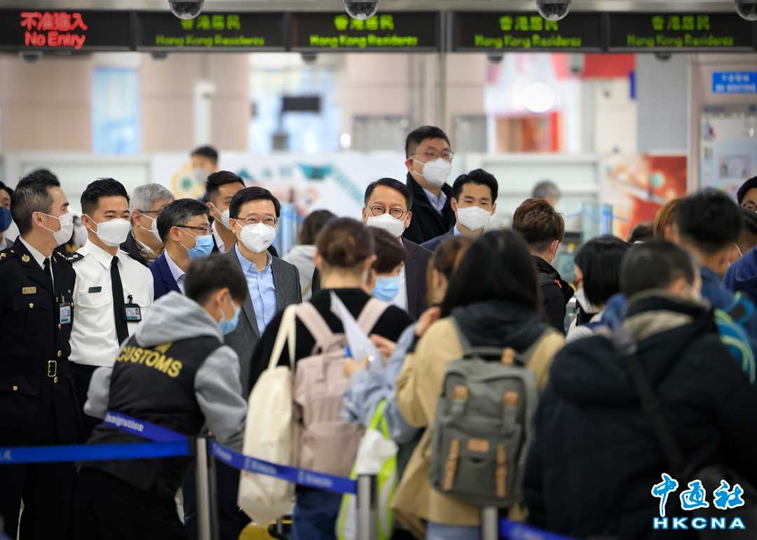 香港新聞網1月8日電 (記者曹文毓)香港1月8日起與內地實施首階段通關,香港中通社記者在落馬洲口岸直擊通關現場。 1月8日早晨6時半起,深圳灣、文錦渡、落馬洲支線3個陸路口岸陸續有內地旅客入境香港,以及香港居民前往內地。根據香港特區政府資訊科技總監辦公室公佈的最新數字,截至7日下午6時,超過41萬人預約過關前往內地。 行政長官李家超、政務司司長陳國基、保安局局長鄧炳強、創新科技及工業局局長孫東以及海關關長何珮珊等今早約8時半,到落馬洲支線管制站巡視,了解市民過關情況,並聽取執勤人員講解。