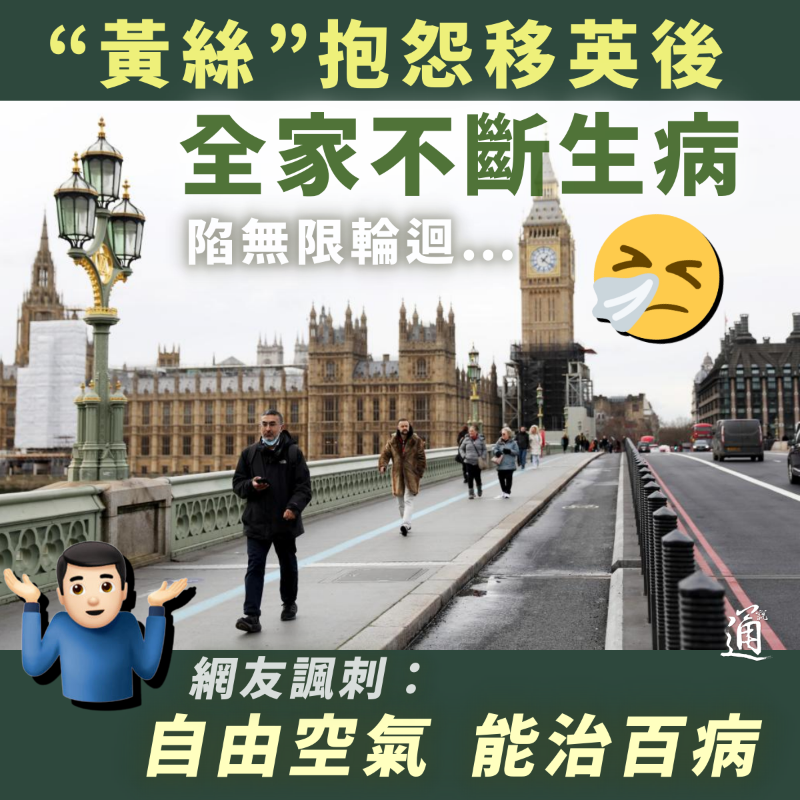 “黃絲”抱怨移英後全家不斷生病 網友諷刺:自由空氣能治百病分享到: