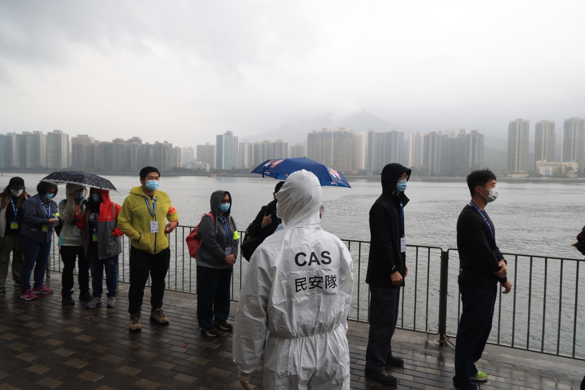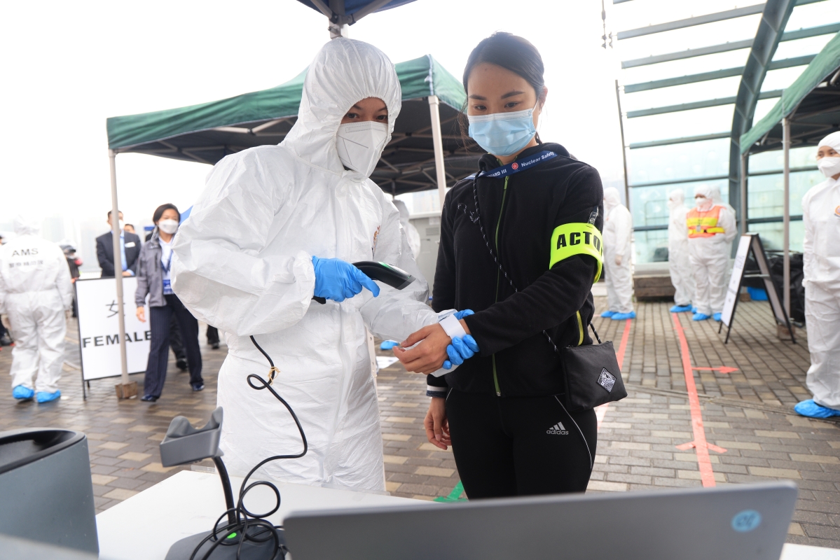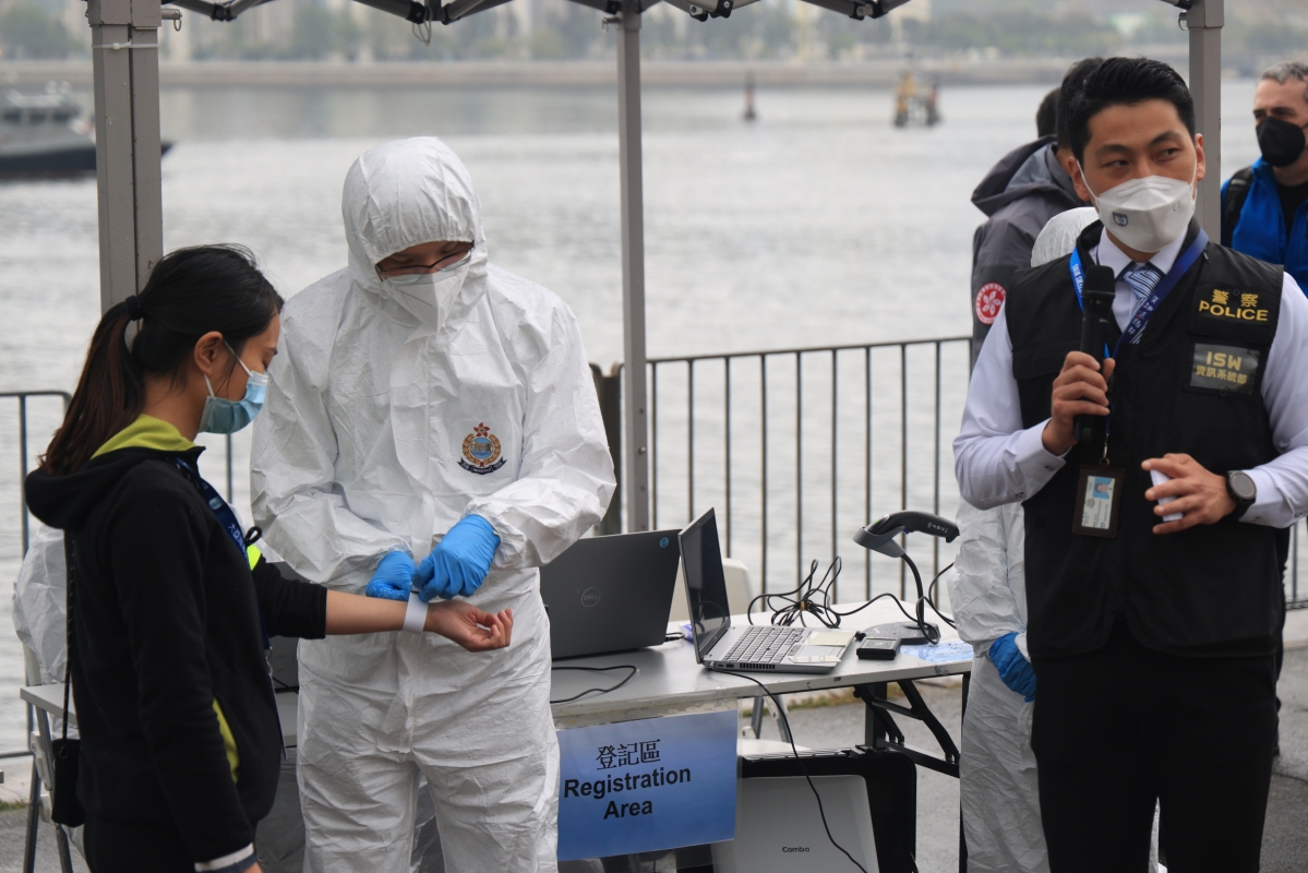 工作人員為撤離人士戴上手環以便識別身份
