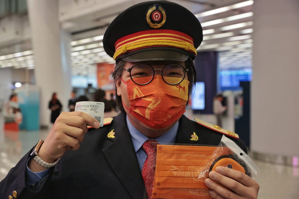 香港新聞網1月15日電 因疫情停運近3年的廣深港高鐵香港段今日(15日)起復運,首班由內地南下的列車,早上約7時40分抵港。運輸及物流局局長林世雄、文化體育及旅遊局局長楊潤雄以及多名港鐵高層,在西九龍站迎接抵港乘客,向他們送上紀念禮物。