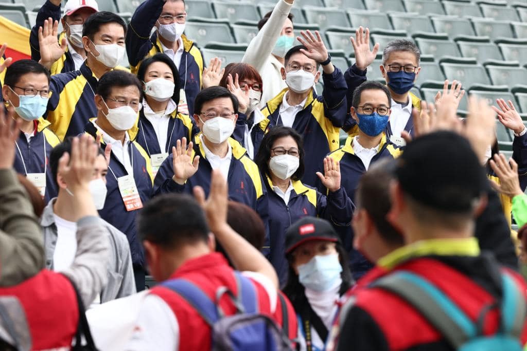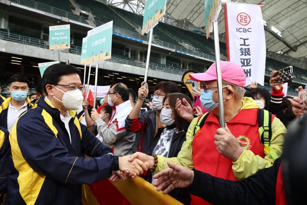 香港新聞網1月15日電 香港特區行政長官李家超15日早上在香港大球場主持了港島區百萬行的起步禮,李家超的夫人林麗嬋以公益金會長身分一同出席。