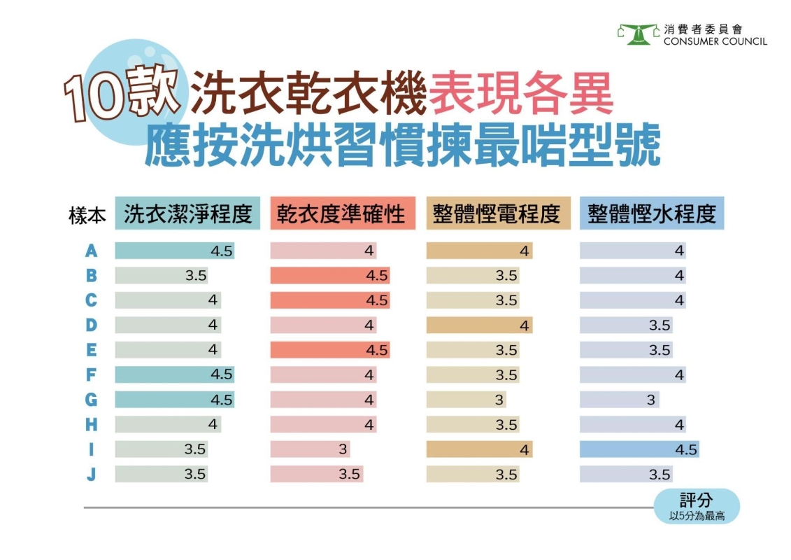 香港消委會圖片。 消委會測試市面上的10款前置式洗衣乾衣機,價錢由5390至21980不等,測試發現總評分最高的分別為Miele的WTD160 WCS(售價為21980港元)、惠而浦的WWEB8502GW(售價為5390港元),以及西門子的WD14S460HK(售價為7490港元)。其中Miele在洗衣潔淨表現、慳電慳水程度均有最高4分,惟在乾衣表現方面,較另外兩個樣本遜色。在總慳電評分方面,有三款同獲最高的4分,分別為Miele的WTD160 WCS,售價為21,980元;飛歌的PWD851400V,售價為6,998元,以及美的MFL80D14,售價為6,499元。 消委會表示,雖然不少洗衣乾衣機都設有“快速洗衣”及“快速洗衣連乾衣”程序,但一般只適合處理小量(例如2公斤以下)及不太骯髒的衣物。洗衣乾衣機動輒數千甚至過萬元,然而各樣本在不同測試環節的表現各有高低:洗衣潔淨程度最出色的樣本,於乾衣度準確性的表現並非最佳;在洗衣程序最慳電的樣本,在乾衣程序的慳電程度則是評分最低。消費者應按自己的洗衣乾衣習慣,例如通常處理較多棉質抑或人造纖維衣物,來挑選合適的型號。如果使用方法正確及保養得宜,可延長機件壽命,符合可持續消費的原則。(完) 【編輯:孟宜君】