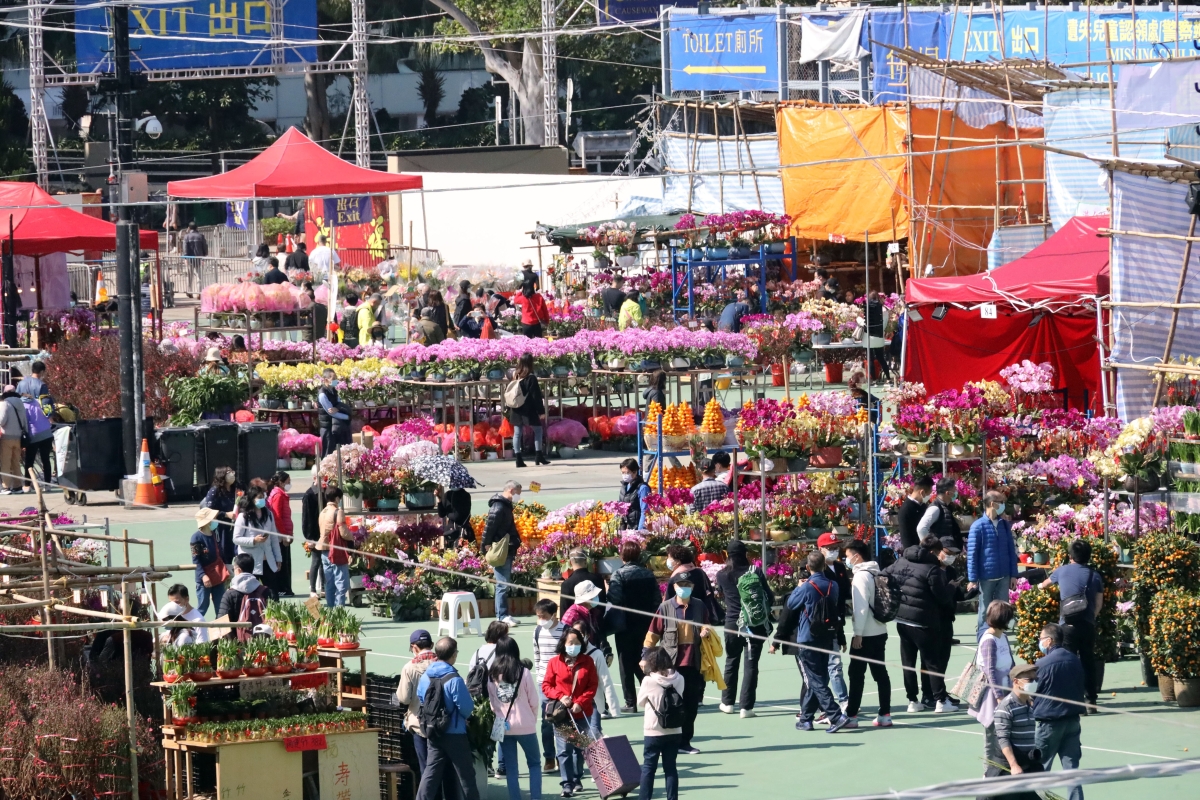 香港天氣晴朗市民到銅鑼灣維園年宵市場選購鮮花歡度農曆新年