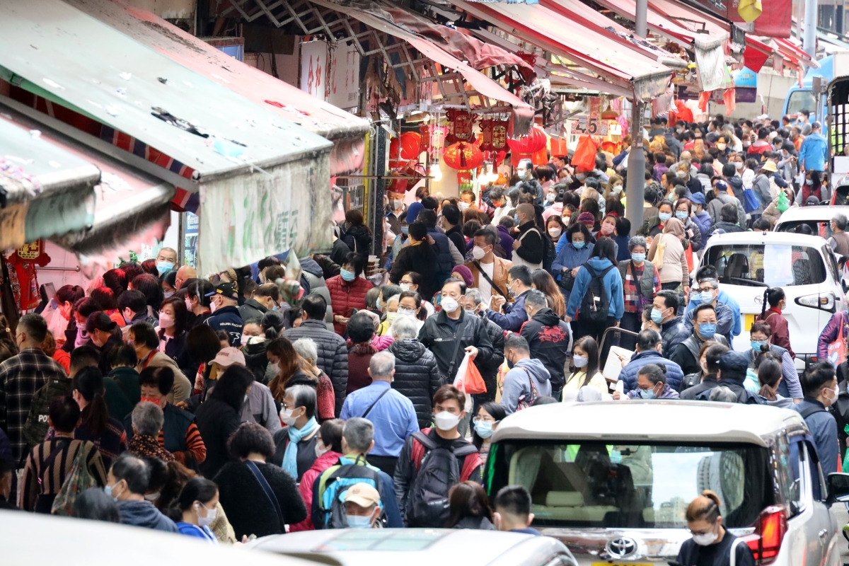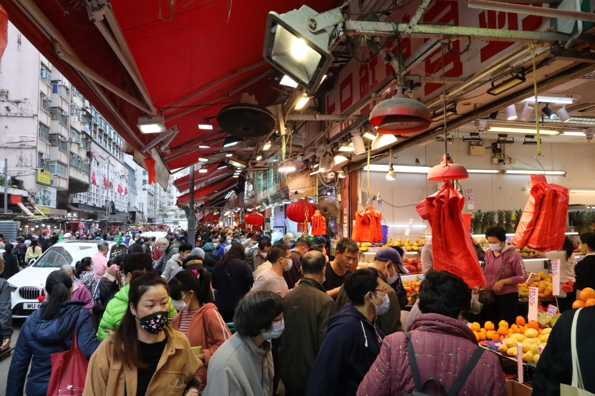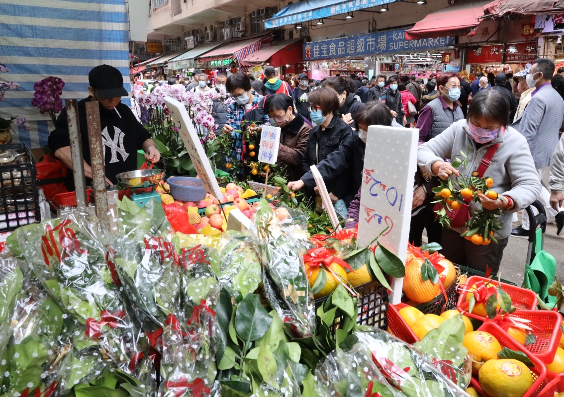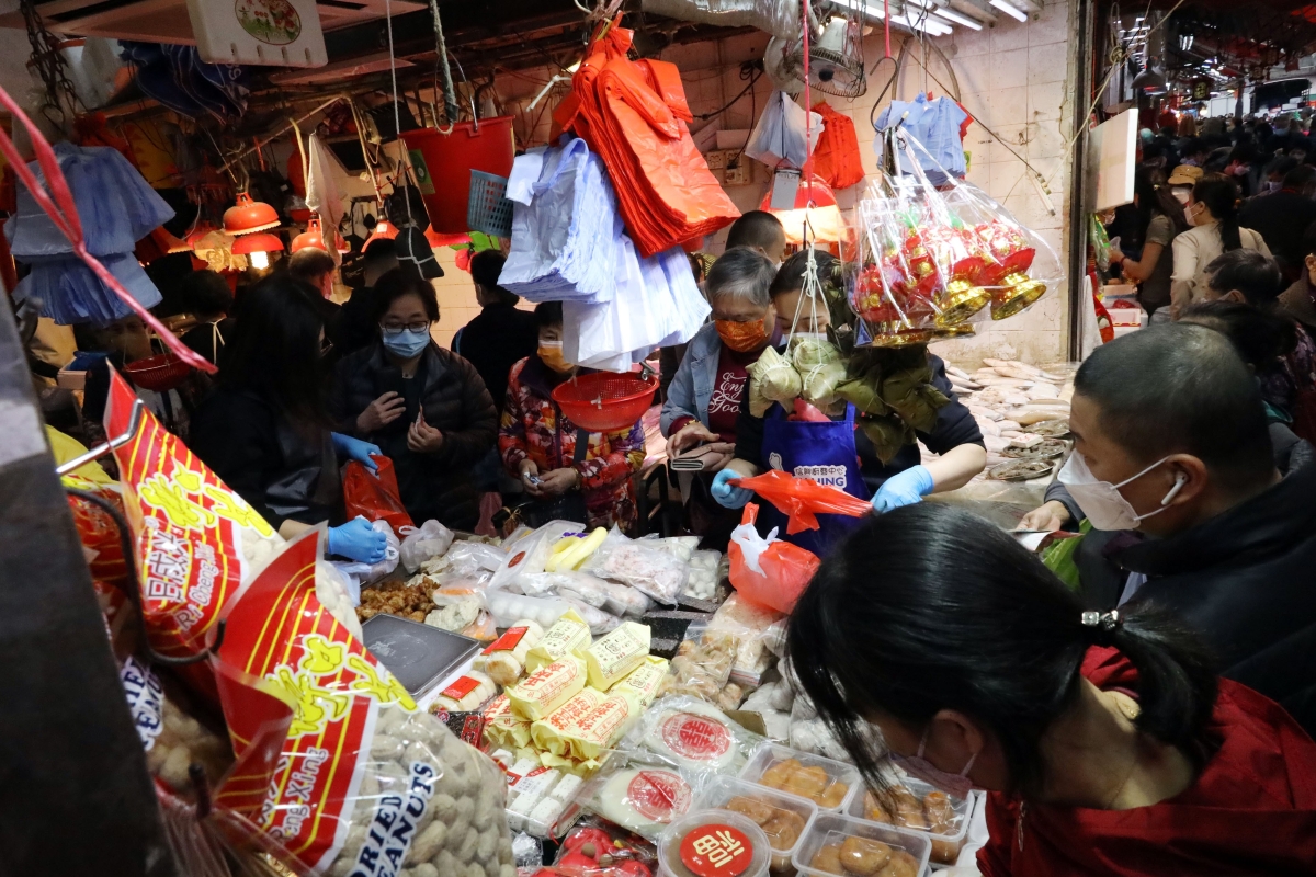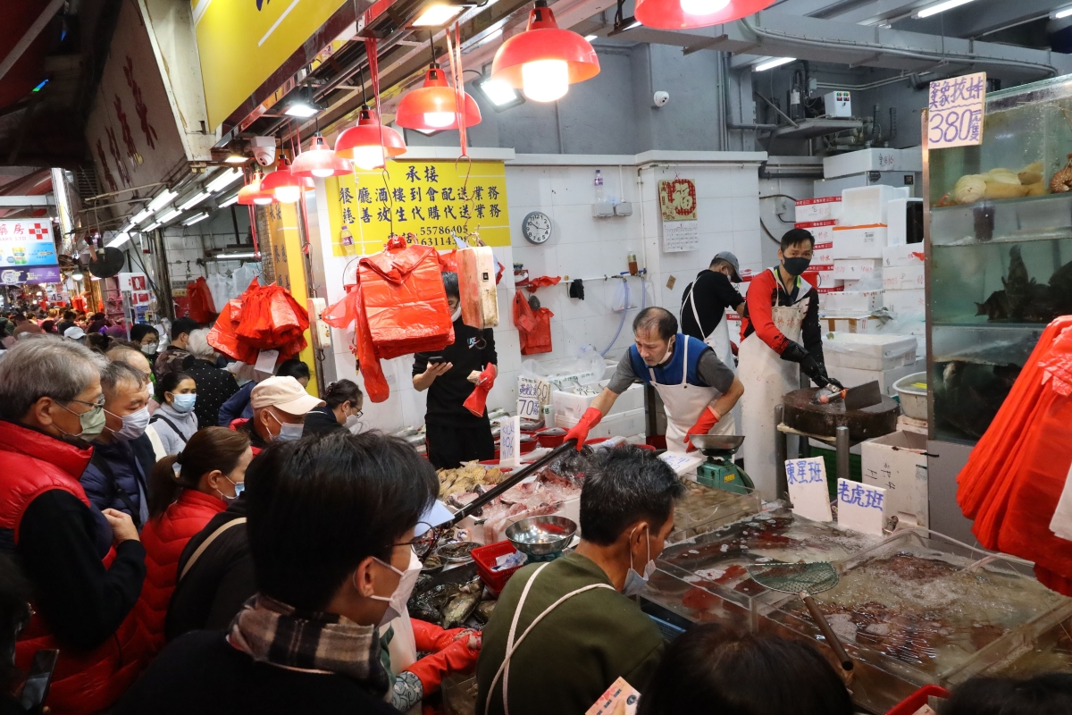 香港市民除夕在春秧街選購新鮮食材,街道兩旁攤檔前水洩不通。