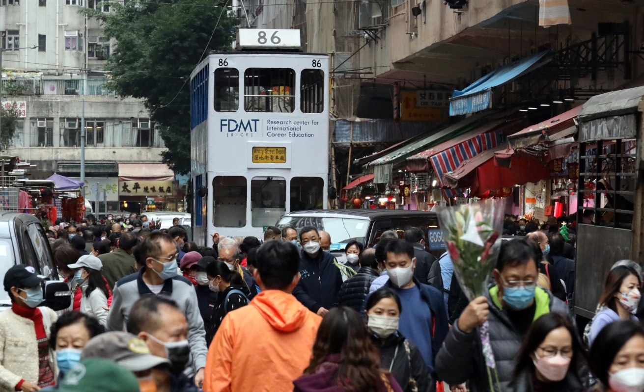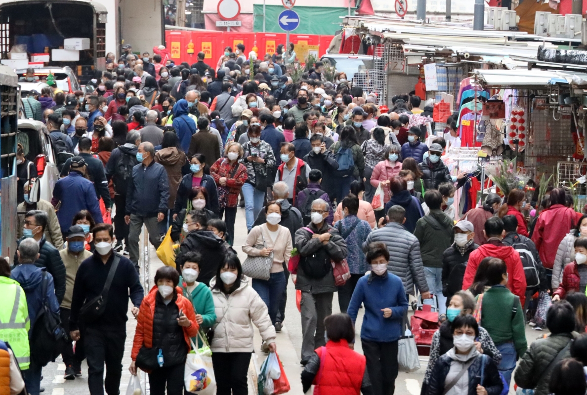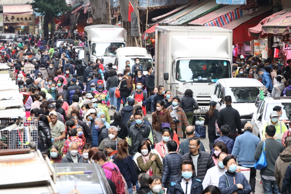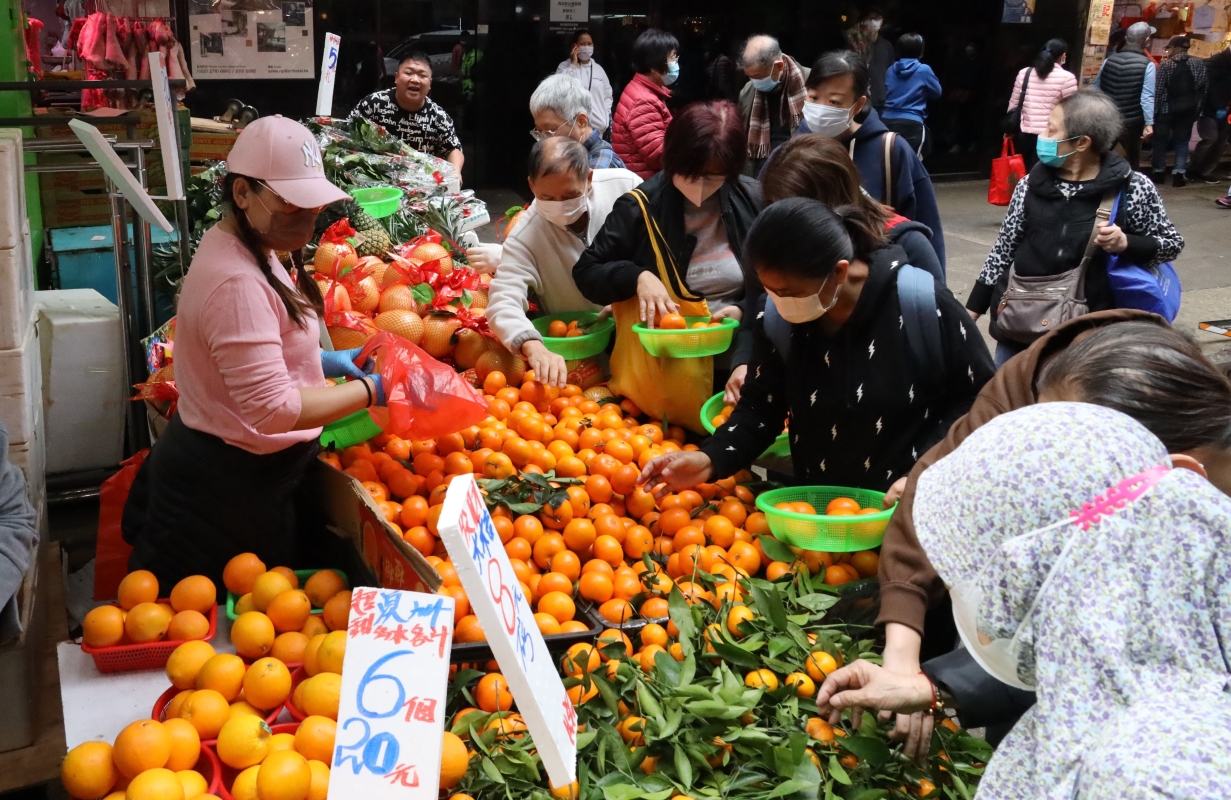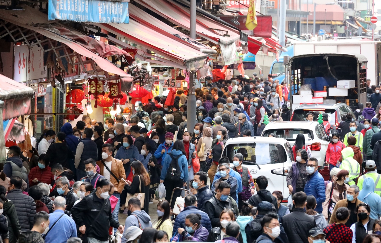 香港市民除夕在春秧街選購新鮮食材,街道兩旁攤檔前水洩不通。