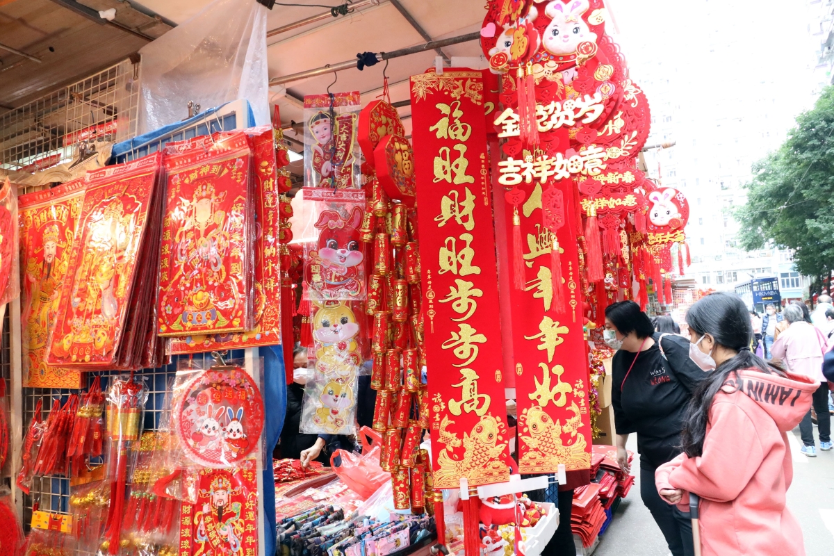 街坊市民到街市選購新鮮食材,揮春掛飾。
