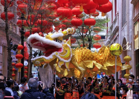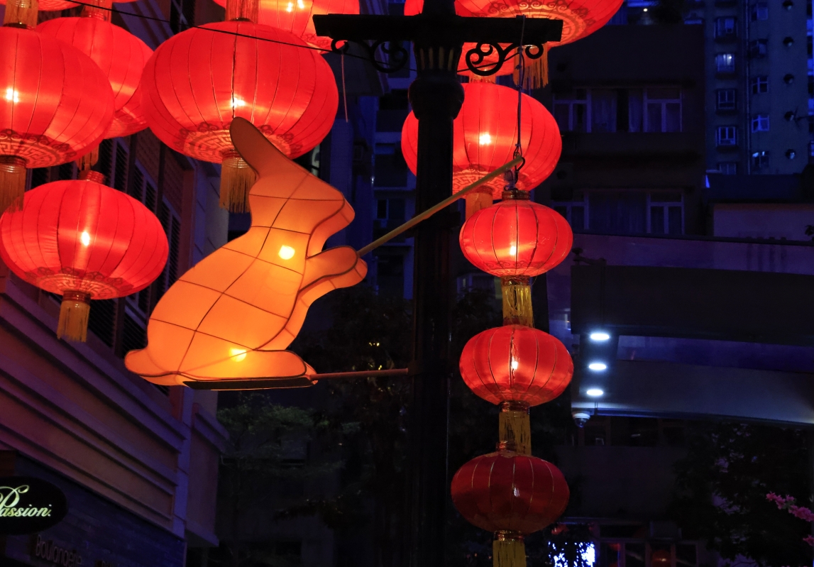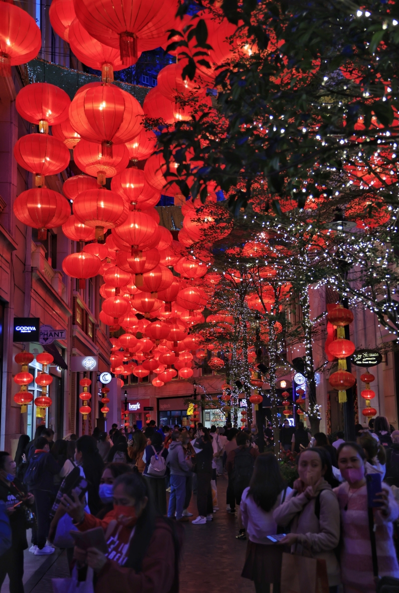 香港新聞網1月22日電(記者 曹文毓)1月22日大年初一,夜幕時分,香港利東街燈籠點亮,紅火一片。不少市民在此合影,歡度新年假期。 除此之外,利東街是次還以“花燈‧彩兔賀新歲”為主題,打造燈光閃耀的戶外新春步行街。林蔭大道飾有688個大紅燈籠添上亮片裝飾、街道燈柱繫上彩兔提燈籠的裝飾,中庭廣場中央設”一家五口“的玉兔燈光裝置,整條街道兔年氣息濃厚。