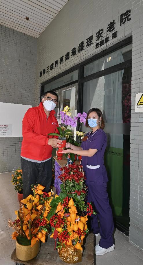 圖示義工隊成員將年花轉贈予一所安老院的代表。(政府新聞處) 【編輯:馬華】