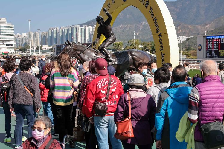 圖為市民排隊與賽馬會雕塑合影。(香港中通社記者 謝光磊 攝) 香港中通社圖片 正月初三俗稱“赤口”,不宜拜年,以避免和朋友發生口角。每年這一天,眾多香港市民就會相約到沙田賽馬場觀賞馬賽,許下馬到成功的心願。 當日上午,在馬場附近的沙田地鐵站,有大量市民等候乘坐途徑馬場站的班車,有人等候地鐵時就拿著筆在寫滿賽馬信息的報紙上勾勾畫畫,提前做準備。當列車抵達馬場站後,市民蜂擁而出,站台瞬間水泄不通,人們緩步移向馬場,亦有不少乘坐輪椅的人士到場感受氣氛。 馬場內也被裝置一番,除設有大型搖錢樹及桃花林讓市民打卡外,更設有行運風車陣祝願市民兔年運轉乾坤,不少市民在大型風車陣前轉動風車,希望轉出好運。 上午11時15分,綜合匯演暨開幕典禮在馬匹亮相圈展開。財政司司長陳茂波出席開幕儀式,與一眾馬會高層主持醒獅點睛,樂壇天后容祖兒也為現場馬迷獻唱多首金曲。 自一月初,香港和内地落實首階段免隔離“通關”後,此次新春賽馬活動吸引了不少内地遊客。來自江蘇的姬先生告訴香港中通社記者,趁著農曆春節假期,特意來香港旅遊,而賽馬作為香港特色項目,一定要來感受現場氣氛。 時隔多年終於能在新春期間入場看賽馬,香港市民高先生約上老友一起來看比賽,沾沾運氣,認為現場氣氛十分熱烈。 當日投注額高達20.6億港元,為香港回歸後投注額的新高,創歷年農曆新年賽馬日投注額的新高。 香港賽馬會行政總裁應家柏表示,馬場氣氛相當熱鬧,農曆新年賽馬日向來特別,喜見眾多馬迷入場觀賽。當日本地投注額上升9.4%,匯合投注額增加15%,他對投注額再創新高感到很高興,認為這亦反映社會大致復常,為兔年取得好開始。(完) 【編輯:凌玉辉】