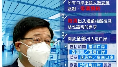 香港中通社圖片 李家超感謝中央政府、國務院港澳辦、國家衞健委、海關總署,廣東省政府和深圳市政府等,對兩地全面通關的支持及所做的大量工作;亦感謝特區政府同事,尤其是通關事務協調組為此所做的大量工作。 據公佈,6日起,跨境口岸將不設人數限制,無需預約;取消出入境前核酸檢測要求,僅需在入境內地前填寫健康申報;全部出入境口岸將正常開放,包括首階段未開的羅湖,並新增蓮塘/香園圍口岸,沙頭角口岸的貨運服務也會恢復;澳門來港前不須快測。 香港亦將取消海外及台灣地區來港人士的疫苗接種要求。惟來港前的快測要求將維持,一段時間後會再作檢視,確保風險可控。
