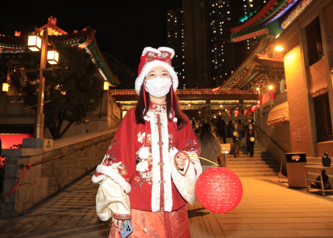 香港新聞網2月5日(記者 曹文毓)2月5日為正月十五元宵節,香港黃大仙祠延長開放至晚上十時,為善信預備了豐富節目。當日,黃大仙祠不少善信參拜月老,祈求天賜良緣,亦有市民穿著漢服遊園,仿如置身古代元宵燈會。