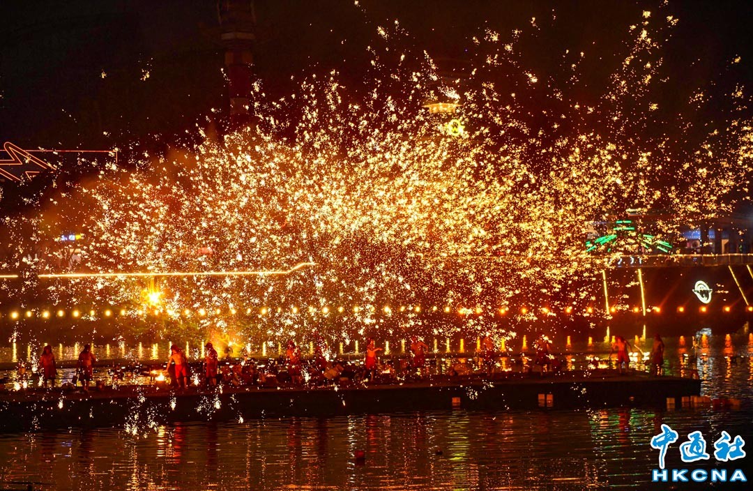 2月1日晚,一場打鐵花表演在重慶歡樂谷景區上演,“火樹銀花”綻放點亮夜空,與湖面相映成趣,吸引民眾觀看。 香港中通社圖片