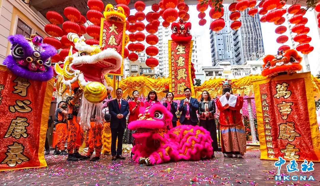 2月3日,香港利東街舉行“金龍醒獅舞動賀新禧”開市典禮。現場呈獻舞龍舞獅表演,一條80多呎巨型金龍,加上5頭彩色醒獅,躍動梅花樁上,配合街道上688個大紅燈籠裝飾,場面盛大壯觀,鑼鼓喧天,氣氛熱熾。圖為一眾主禮嘉賓。(香港中通社記者 曹文毓攝)