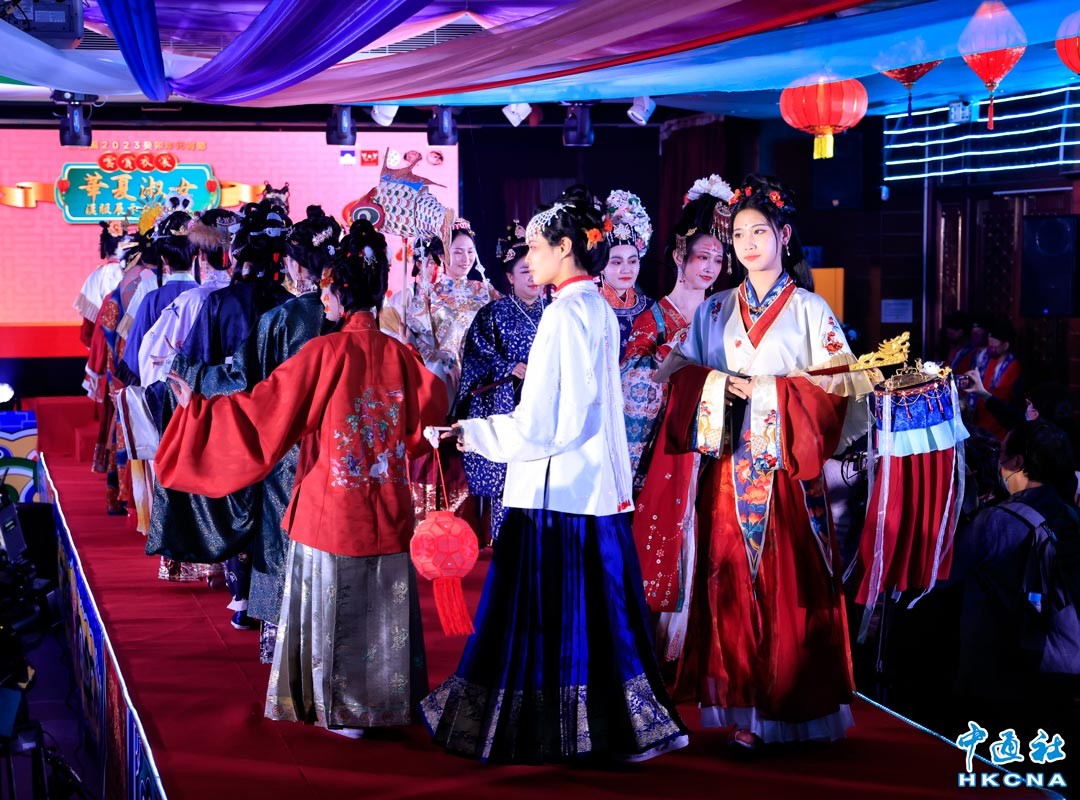2月5日為元宵節,“雲賞衣裳”華夏淑女漢服展示大賽在香港黃大仙祠舉行,旨在讓公眾認識華夏衣冠的精髓,傳承中華文化。(香港中通社記者 曹文毓攝)